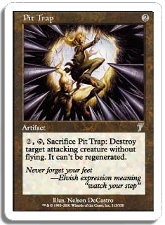 2, T, Sacrifice Pit Trap: Destroy target attacking creature without flying. It can't be regenerated.