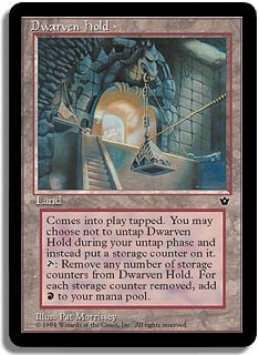 Comes into play tapped. You may choose not to untap Dwarven Hold during your untap phase and instead put a storage counter on it. <T>: Remove any number of storage counters from Dwarven Hold. For each storage counter removed, add <R> to your mana pool.