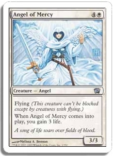 Flying (This creature can't be blocked except by creatures with flying.) When Angel of Mercy comes into play, you gain 3 life.