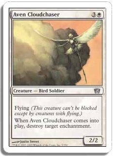 Flying (This creature can't be blocked except by creatures with flying.) When Aven Cloudchaser comes into play, destroy target enchantment.