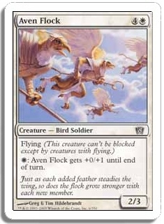Flying (This creature can't be blocked except by creatures with flying.) W: Aven Flock gets +0/+1 until end of turn.