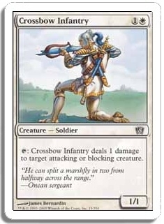 T: Crossbow Infantry deals 1 damage to target attacking or blocking creature.
