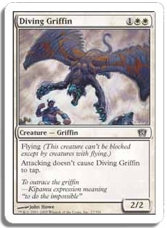 Flying (This creature can't be blocked except by creatures with flying.) Attacking doesn't cause Diving Griffin to tap.