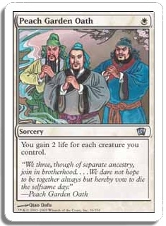 "We three, though of separate ancestry, join in brotherhood. . . . We dare not hope to be together always but hereby vow to die the selfsame day." -Peach Garden Oath