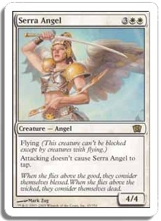 Flying (This creature can't be blocked except by creatures with flying.) Attacking doesn't cause Serra Angel to tap.