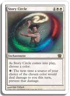As Story Circle comes into play, choose a color. W: The next time a source of your choice of the chosen color would deal damage to you this turn, prevent that damage.