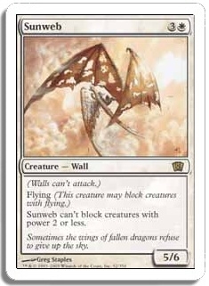 (Walls can't attack.) Flying (This creature may block creatures with flying.) Sunweb can't block creatures with power 2 or less.
