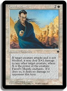 If target creature attacks and is not blocked, it may deal X+2 damage to any other target creature, where X is the power of the creature Farrel's Mantle enchants. If it does so, it deals no damage to opponent this turn.