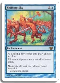 As Shifting Sky comes into play, choose a color. All nonland permanents are the chosen color.