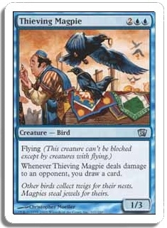 Flying (This creature can't be blocked except by creatures with flying.) Whenever Thieving Magpie deals damage to an opponent, you draw a card.