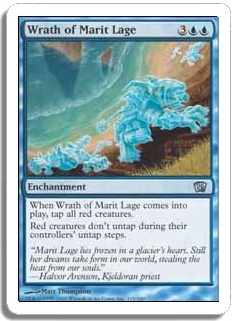 When Wrath of Marit Lage comes into play, tap all red creatures. Red creatures don't untap during their controllers' untap steps.