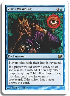Players play with their hands revealed. If a player would draw a card, he or she reveals it instead. Then any other player may pay 2 life. If a player does, put that card into its owner's graveyard. Otherwise, that player draws the card.