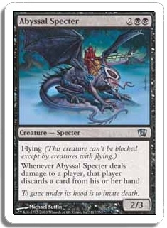 Flying (This creature can't be blocked except by creatures with flying.) Whenever Abyssal Specter deals damage to a player, that player discards a card from his or her hand.