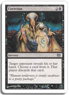 Target opponent reveals his or her hand. Choose a card from it. That player discards that card.