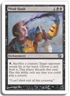 B, Sacrifice a creature: Target opponent reveals his or her hand. Choose a card from it. That player discards that card. Play this ability only any time you could play a sorcery.