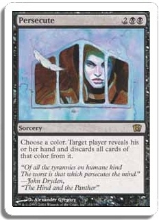 Choose a color. Target player reveals his or her hand and discards all cards of that color from it.