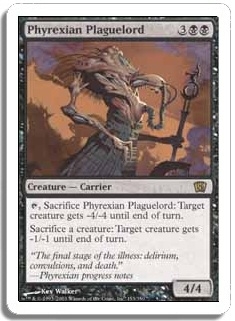 T, Sacrifice Phyrexian Plaguelord: Target creature gets -4/-4 until end of turn. Sacrifice a creature: Target creature gets -1/-1 until end of turn.