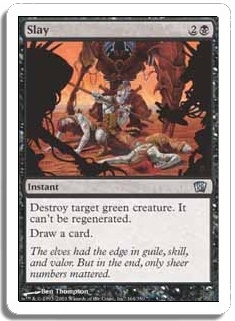 Destroy target green creature. It can't be regenerated. Draw a card.