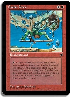 <R>: A target creature you control, which cannot have a toughness greater than 2, gains flying until end of turn. Other effects may later be used to increase the creature's toughness. At end of turn, flip a coin; opponent calls heads or tails while coin is in the air. If the flip ends up in opponent's favor, bury that creature.