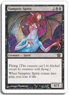 Flying (This creature can't be blocked except by creatures with flying.) When Vampiric Spirit comes into play, you lose 4 life.