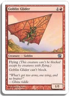 Flying (This creature can't be blocked except by creatures with flying.) Goblin Glider can't block.