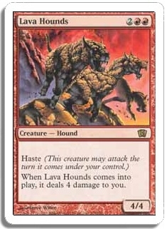 Haste (This creature may attack the turn it comes under your control.) When Lava Hounds comes into play, it deals 4 damage to you.