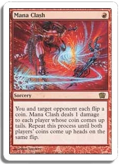 You and target opponent each flip a coin. Mana Clash deals 1 damage to each player whose coin comes up tails. Repeat this process until both players' coins come up heads on the same flip.