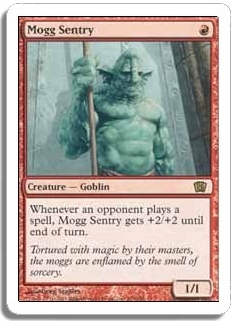 Whenever an opponent plays a spell, Mogg Sentry gets +2/+2 until end of turn.
