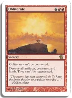 Obliterate can't be countered. Destroy all artifacts, creatures, and lands. They can't be regenerated.