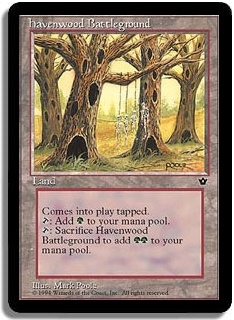 Comes into play tapped. <T>: Add <G> to your mana pool. <T>: Sacrifice Havenwood Battleground to add <GG> to your mana pool.