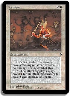 <0>: Sacrifice a white creature to have attacking red creatures deal no damage during combat this turn. The attacking player may pay <2R> for an attacking creature to have it deal damage as normal.