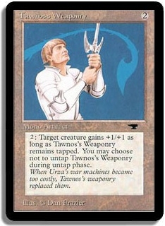 <2>: Target creature gets +1/+1 as long as Tawnos's Weaponry remains tapped. You may choose not to untap Tawnos's Weaponry during your untap phase.