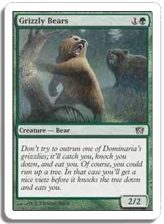Don't try to outrun one of Dominaria's grizzlies; it'll catch you, knock you down, and eat you. Of course, you could run up a tree. In that case you'll get a nice view before it knocks the tree down and eats you.