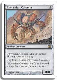 Phyrexian Colossus doesn't untap during your untap step. Pay 8 life: Untap Phyrexian Colossus. Phyrexian Colossus can't be blocked except by three or more creatures.