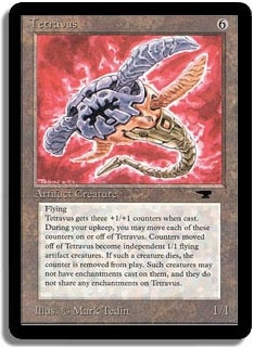 Flying. When Tetravus comes into play, put three +1/+1 counters on it. During your upkeep, you may move each of these counters on or off of Tetravus, regardless of who controls them. Counters that are removed become Tetravite tokens. Treat these tokens as 1/1 artifact creatures with flying. These creatures cannot have enchantments played on them and do not share any enchantments on Tetravus.