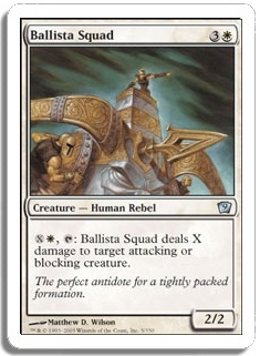 XW, tap: Ballista Squad deals X damage to target attacking or blocking creature.