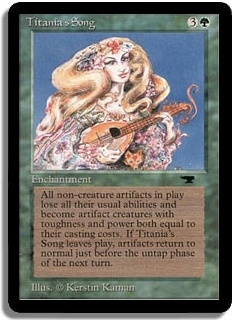 All non-creature artifacts lose all their usual abilities and become artifact creatures with toughness and power each equal to their casting costs. If Titania's Song leaves play, artifacts return to normal just before the untap phase of the next turn.