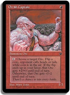 <1>: Choose a target Orc. Flip a coin; opponent calls heads or tails while coin is in the air. If the flip ends up in your favor, that Orc gets +2/+0 until end of turn. Otherwise, that Orc gets -0/-2 until end of turn.