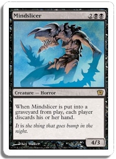 When Mindslicer is put into a graveyard from play, each player discards his or her hand.