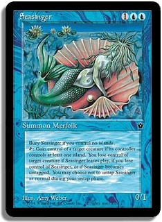 Bury Seasinger if you control no islands. <T>: Gain control of a target creature if its controller controls at least one island. You lose control of target creature if Seasinger leaves play, if you lose control of Seasinger, or if Seasinger becomes untapped. You may choose not to untap Seasinger as normal during your untap phase.