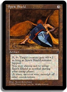 <2,T>: Target creature gets +0/+2 as long as Spirit Shield remains tapped. You may choose not to untap Spirit Shield as normal during your untap phase.