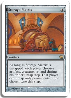 As long as Storage Matrix is untapped, before a player untaps all permanents he or she controls during his or her untap step, that player chooses artifacts, creatures, or lands. Permanents not of the chosen type don't untap this untap step.