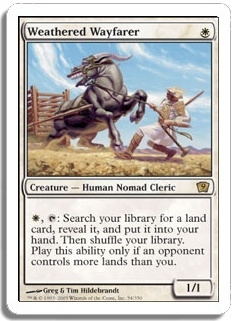 W, tap: Search your library for a land card, reveal it, and put it in your hand. Then shuffle your library. Play this ability only if an opponent controls more lands than you.