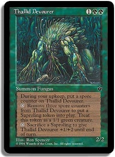 During your upkeep, put a spore counter on Thallid Devourer. <0>: Remove three spore counters from Thallid Devourer to put a Saproling token into play. Treat this token as a 1/1 green creature. <0>: Sacrifice a Saproling to give Thallid Devourer +1/+2 until end of turn.