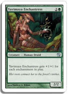 Yavimaya Enchantress gets +1/+1 for each enchantment in play.