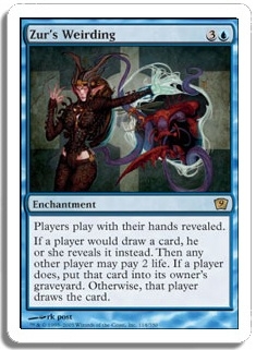 If a player would draw a card, he or she reveals it instead. Then any other player may pay 2 life. If a player does, put that card into its owner's graveyard. Otherwise, that player draws the card.