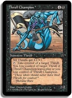 All Thrulls get +1/+1. <T>: Take control of a target Thrull. You lose control of target Thrull if Thrull Champion leaves play or you lose control of Thrull Champion.