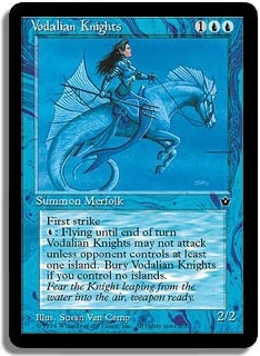 First Strike. <U>: Flying until end of turn. Vodalian Knights may not attack unless opponent controls at least one island. Bury Vodalian Knights if you control no islands.