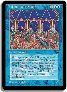 <0>: Tap target Merfolk you control to allow Vodalian War machine to attack this turn or to give Vodalian War Machine +2/+1 until end of turn. If Vodalian War Machine is put in the graveyard, all Merfolk tapped in this manner this turn are destroyed.