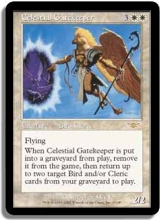 When Celestial Gatekeeper is put into a graveyard from play, remove it from the game, then return up to two target Bird and/or Cleric cards from your graveyard to play.